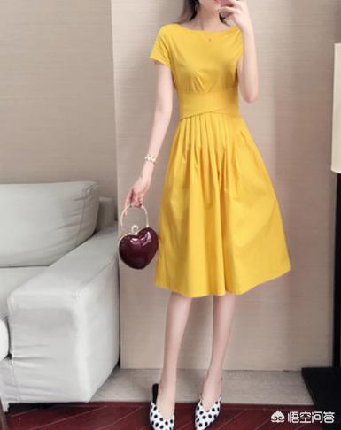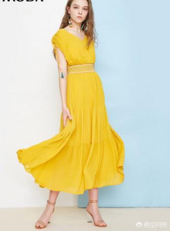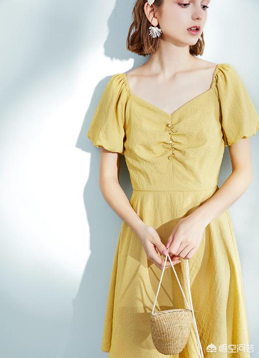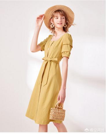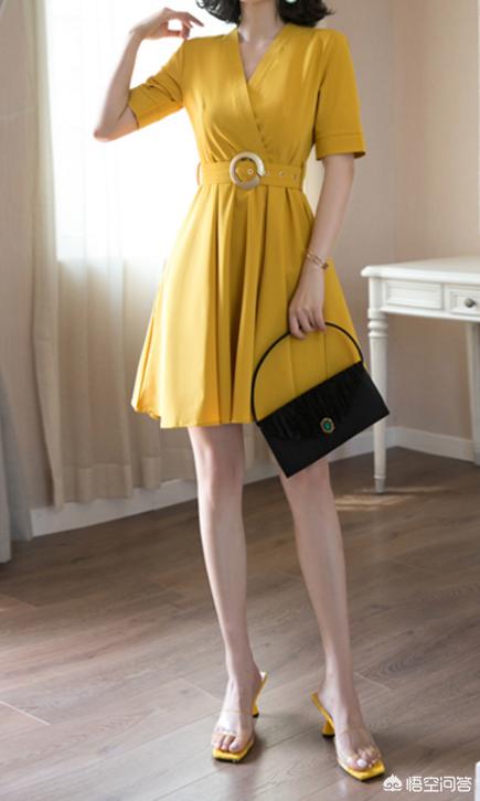 饱和度很高的连衣裙,不需要太多配饰,都会给人眼前一亮的感觉。这条姜黄色的连衣裙真的非常显白!这种V领收腰的款式,可以很好地修饰脖颈线条,视觉上也会显得比较瘦。
